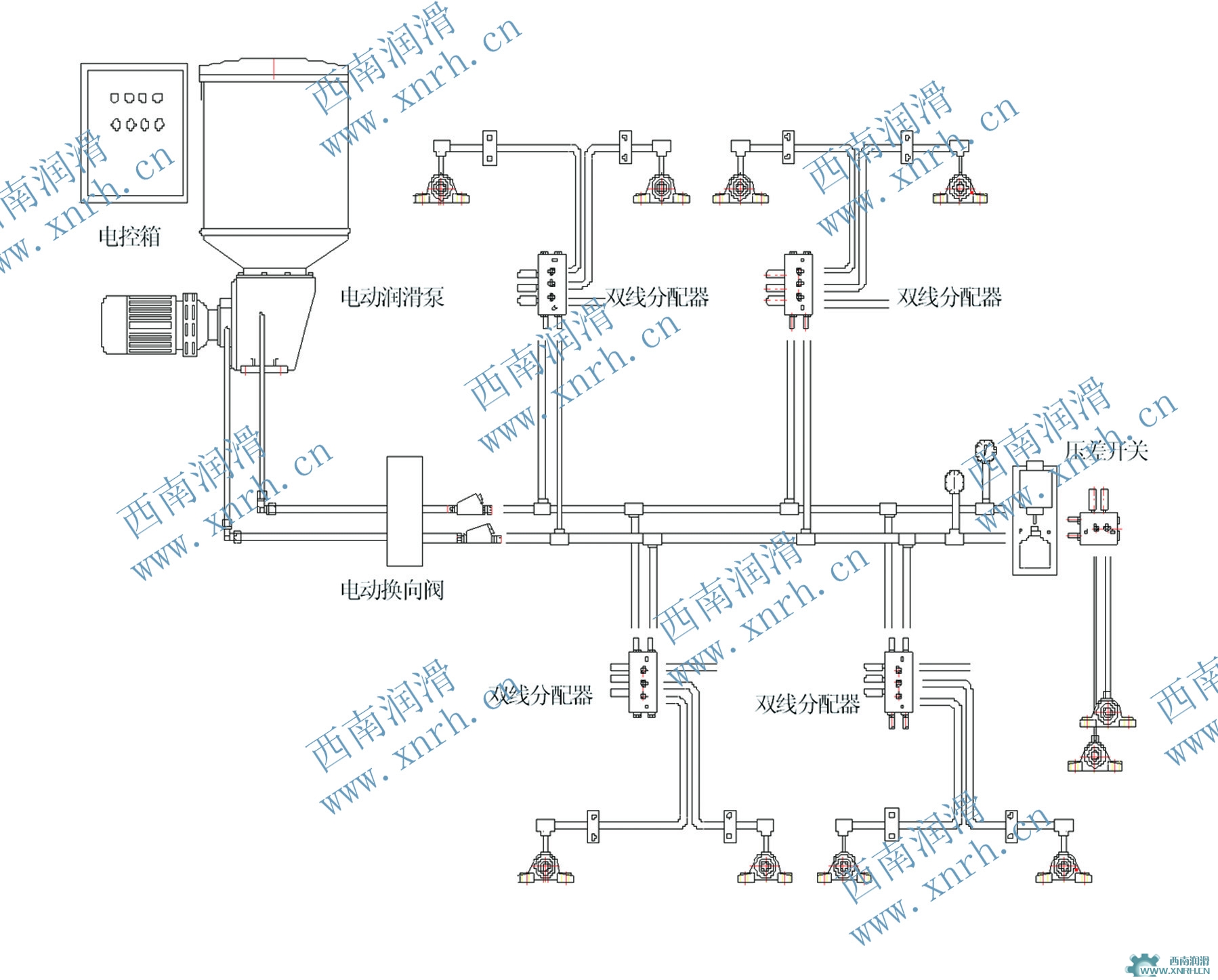 双线系统工作时,首先电动润滑泵(或手动润滑泵)开始动作打油,油脂经换向阀交替由两条管路输送到双线分配器,向润滑点注油。供油管内的压力达到分配器所需动作压力,分配器进行动作,而分配器动作完成又使油管内压力继续上升,当供油管各次压力都使分配器完成动作(系统完成一次给油运行)后,系统压力升到换向阀换向压力,换向阀换向进行二次给油。
